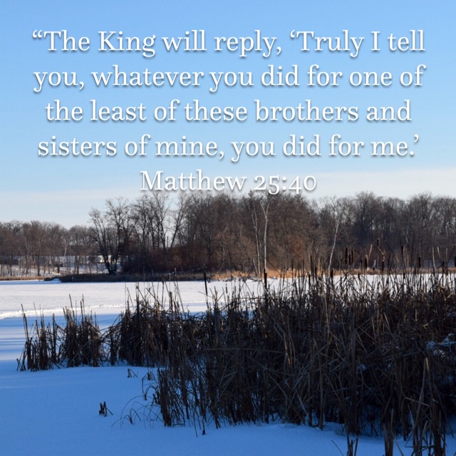 “The King will reply, ‘Truly I tell you, whatever you did for one of the least of these brothers and sisters of mine, you did for me.’”